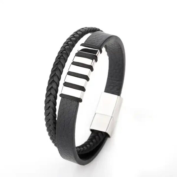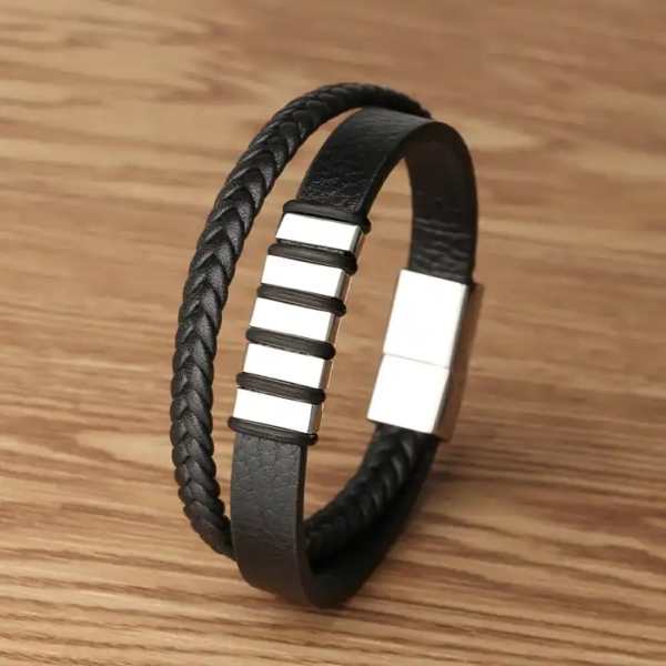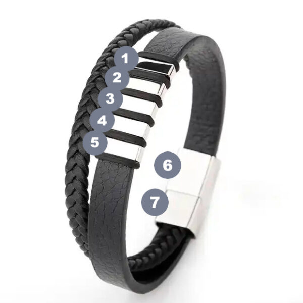 Elegancka męska bransoletka skórzana z aż 7 polami do graweru. Idealna do wygrawerowania wszystkich najbliższych Ci osób i “trzymaniu ich” zawsze przy sobie. Skóra z elementami ze stali szlachetnej to połączenie doskonałego rzemiosła i nowoczesnego designu, stworzone z myślą o mężczyznach, którzy cenią sobie wysoką jakość i unikalny wygląd.