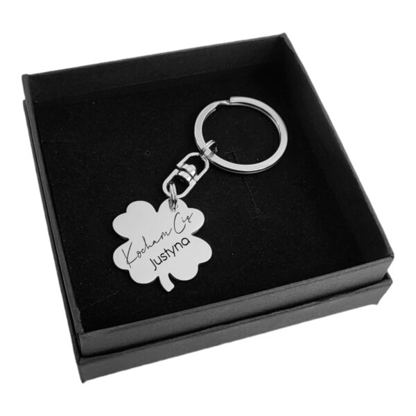 Brelok koniczynka z osobistym grawerem – symbol szczęścia i pozytywnej energii. Wykonany ze stali szlachetnej, elegancki i gotowy do wręczenia w pudełku.