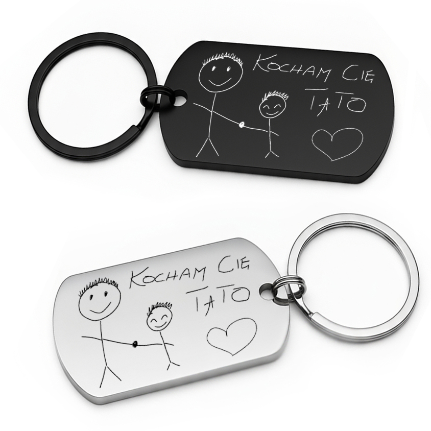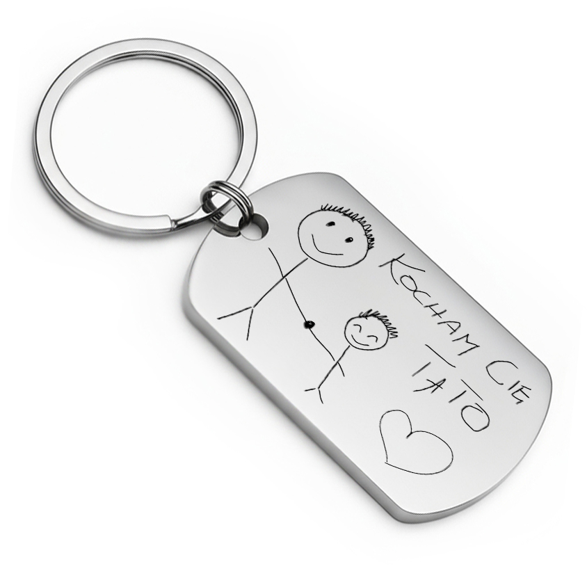 Ten brelok pozwala przenieść dziecięcy rysunek na trwałą stal, tworząc osobistą pamiątkę, która zawsze będzie przy Tobie.