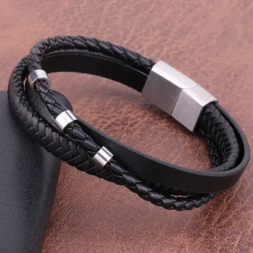 Elegancka męska bransoletka skórzana ze srebrnymi błyszczącymi elementami to połączenie doskonałego rzemiosła i nowoczesnego designu, stworzone z myślą o mężczyznach, którzy cenią sobie wysoką jakość i unikalny wygląd.