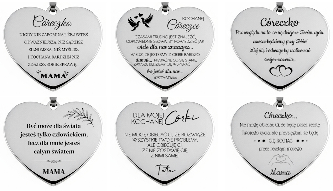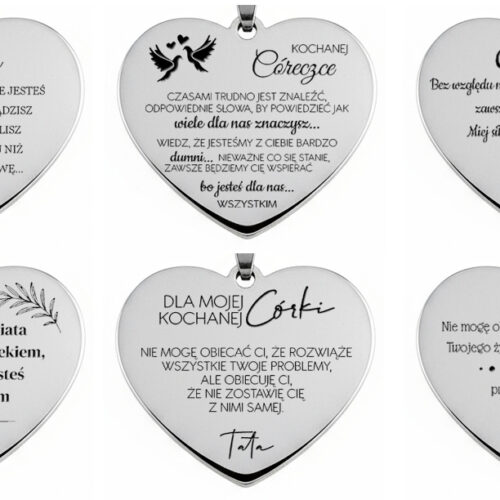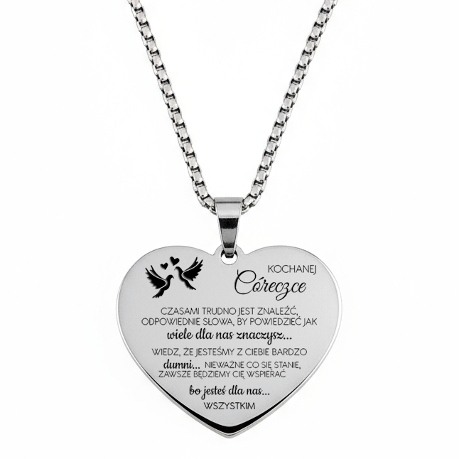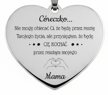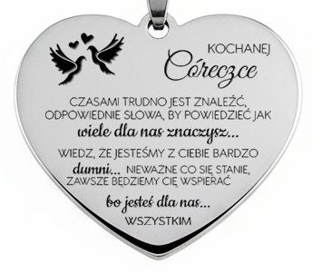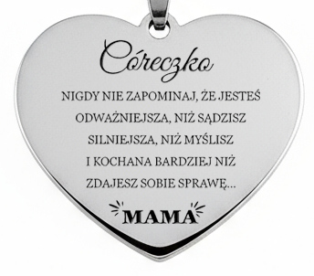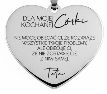 Naszyjnik dla córki z grawerem to wyjątkowy sposób, by przekazać najpiękniejsze słowa i uczucia. Wykonany z stali szlachetnej, zachwyca elegancją, trwałością i emocjonalnym przesłaniem. Serce z delikatnym napisem staje się nie tylko ozdobą, lecz także pamiątką pełną miłości, która przypomina o więzi matki i córki. To prezent, który mówi więcej niż tysiąc słów i zostaje w sercu na zawsze.