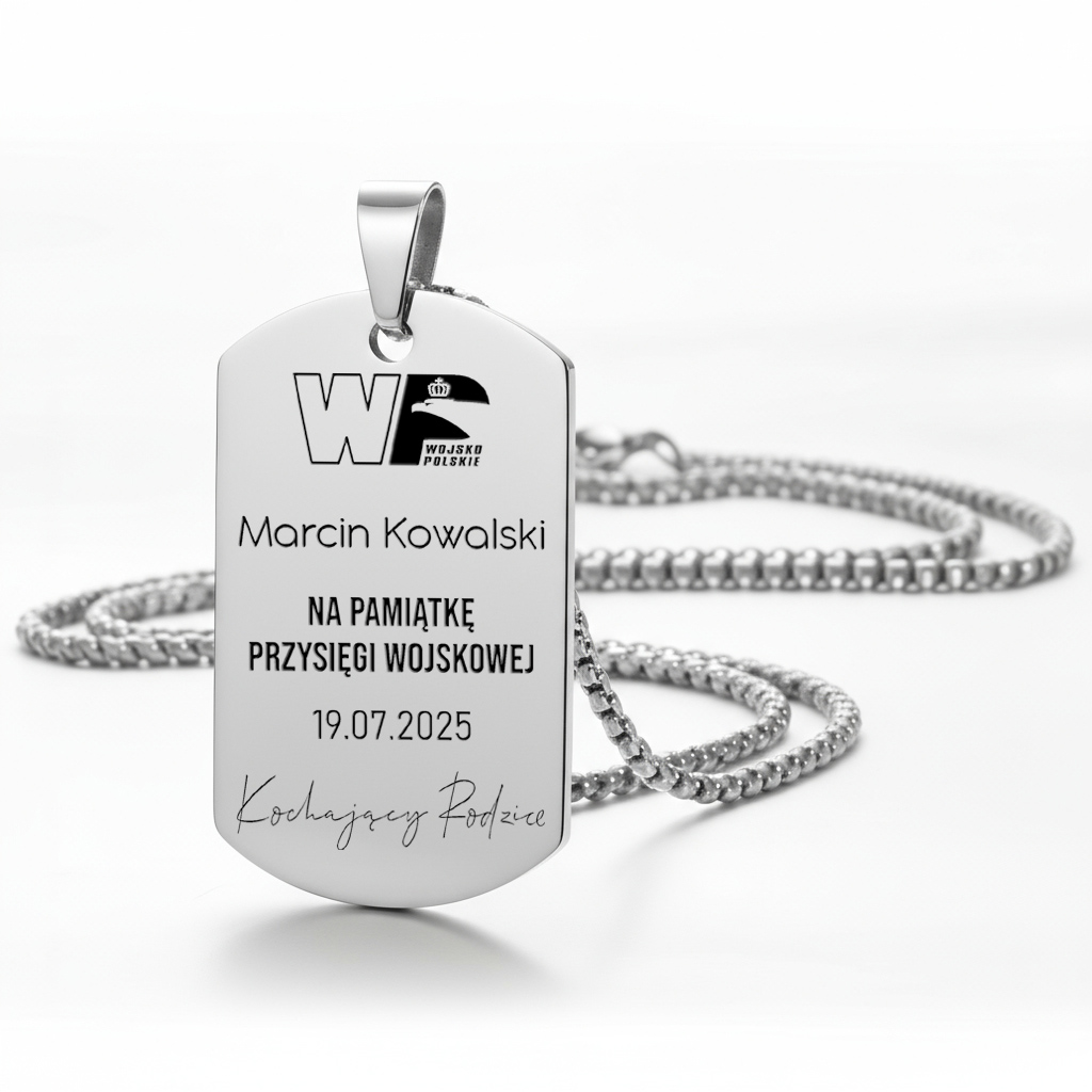Nieśmiertelnik – Pamiątka Przysięgi Wojskowej to wyjątkowy symbol dumy i honoru każdego żołnierza. Z jednej strony zawiera pełną rotę przysięgi wojskowej, z drugiej spersonalizowany grawer z imieniem, datą i podpisem osoby wręczającej. Wykonany ze stali szlachetnej, stanowi trwałą i wzruszającą pamiątkę tego wyjątkowego dnia. Idealny prezent dla każdego, kto wstępuje w szeregi Wojska Polskiego.